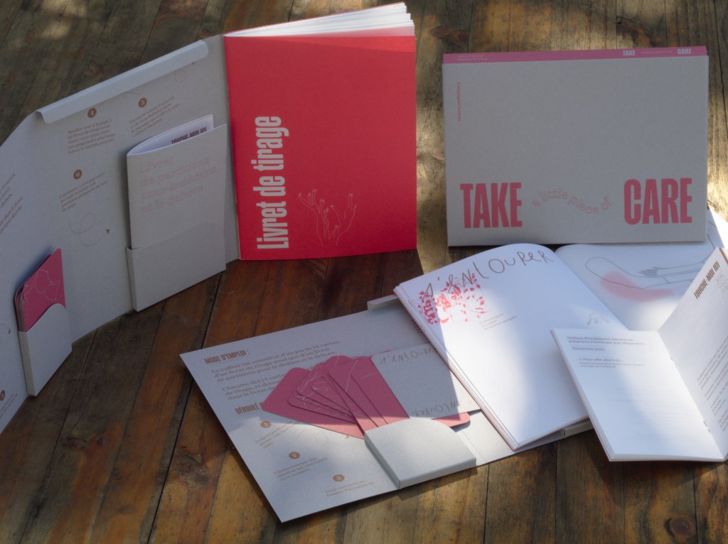À l’intersection entre un oracle et un manuel guidant des pratiques de mouvement, de danse, de marche, de toucher et d’attention, TAKE a little piece of CARE est une invitation à prendre un temps pour soi – seul·e ou avec d’autres – et à explorer l’expression « prendre soin » en se laissant mener le long d’un chemin poétique et corporel.